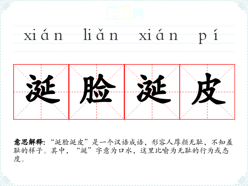 “涎脸涎皮”是一个汉语成语,形容人厚颜无耻,不知羞耻的样子。其中,“涎”字意为口水,这里比喻为无耻的行为或态度。