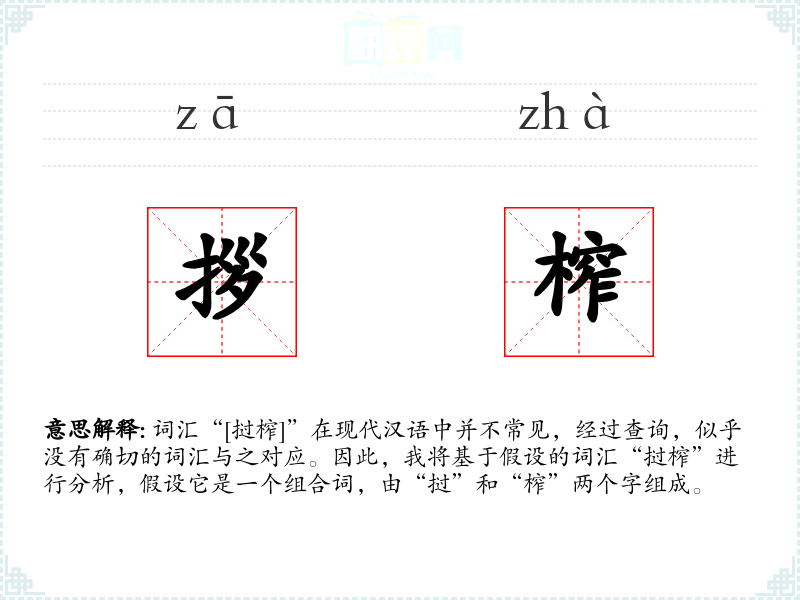 词汇“[挝榨]”在现代汉语中并不常见,经过查询,似乎没有确切的词汇与之对应。因此,我将基于假设的词汇“挝榨”进行分析,假设它是一个组合词,由“挝”和“榨”两个字组成。