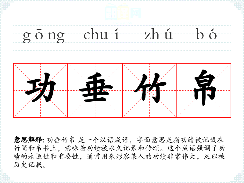 功垂竹帛 是一个汉语成语,字面意思是指功绩被记载在竹简和帛书上,意味着功绩被永久记录和传颂。这个成语强调了功绩的永恒性和重要性,通常用来形容某人的功绩非常伟大,足以被历史记载。
