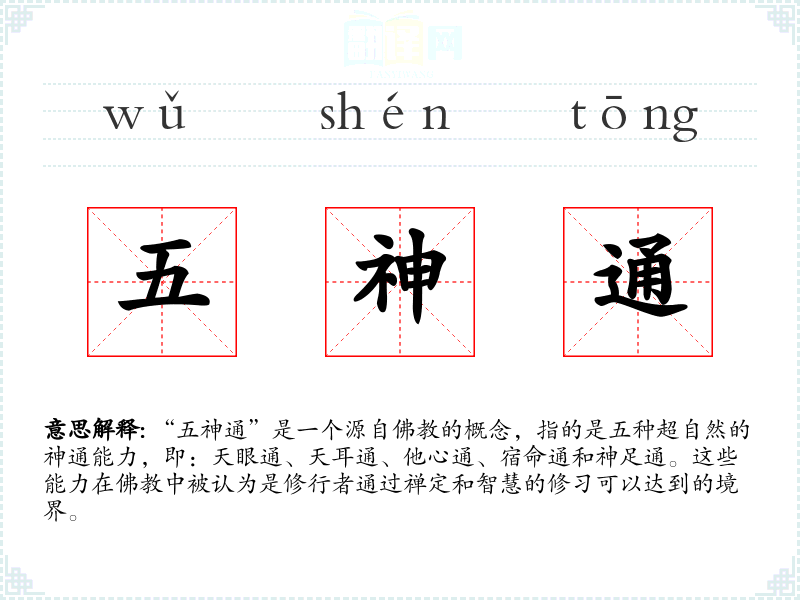 “五神通”是一个源自的概念,指的是五种超自然的神通能力,即:天眼通、天耳通、他心通、宿命通和神足通。这些能力在中被认为是修行者通过禅定和智慧的修*可以达到的境界。