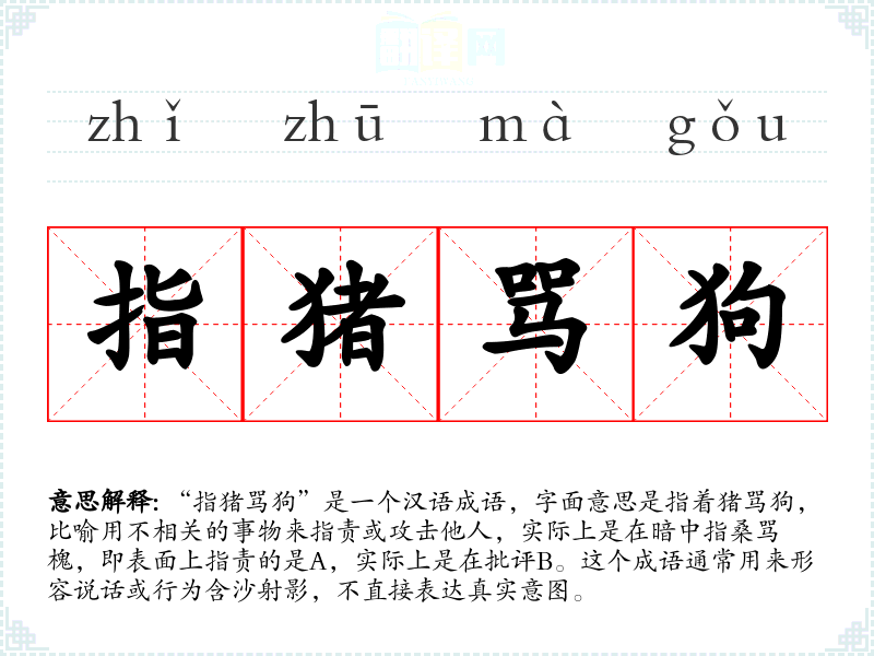 “指猪骂狗”是一个汉语成语,字面意思是指着猪骂狗,比喻用不相关的事物来指责或攻击他人,实际上是在暗中指桑骂槐,即表面上指责的是A,实际上是在批评B。这个成语通常用来形容说话或行为含沙射影,不直接表达真实意图。