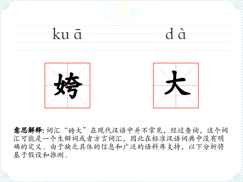 由于“姱大”不是一个常见的词汇,我们无法提供一个确切的基本定义。它可能是某个方言中的词汇,或者是古代文献中的用语。