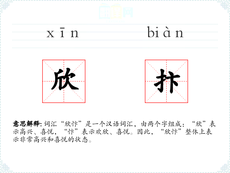 - 词源:欣忭的词源较为古典,源自古代汉语,其中“欣”字古已有之,表示高兴;“忭”字则较为少见,源自“忭跃”,表示欢跃、喜悦。