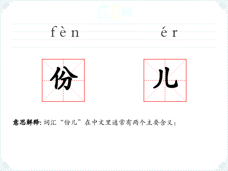 词汇“份儿”在中文里通常有两个主要含义: