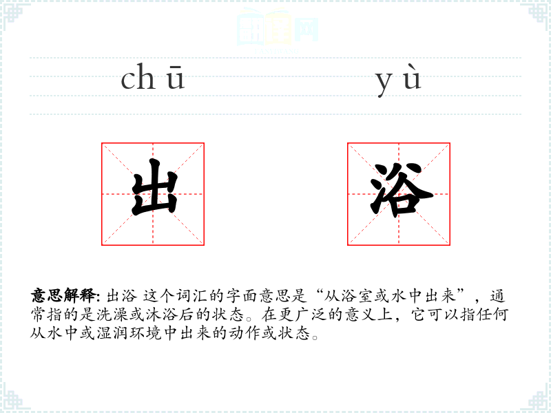 “出浴”这个词汇在中文中历史悠久,其基本结构“出”和“浴”分别表示“出来”和“洗澡”,组合起来即表示“从洗澡的状态中出来”。随着时间的推移,这个词的用法和含义没有太大变化,但在文学和艺术中,它被赋予了更多的象征意义。