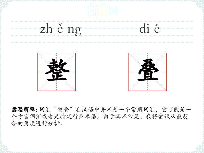 词汇“整叠”在汉语中并不是一个常用词汇,它可能是一个方言词汇或者是特定行业术语。由于其不常见,我将尝试从最契合的角度进行分析。