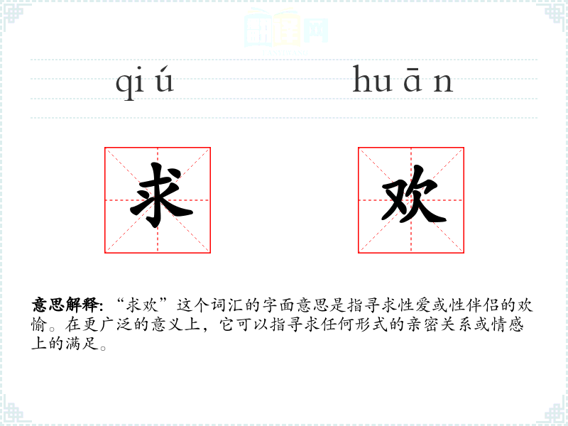 “求欢”这个词汇的字面意思是指寻求性爱或性伴侣的欢愉。在更广泛的意义上,它可以指寻求任何形式的亲密关系或情感上的满足。