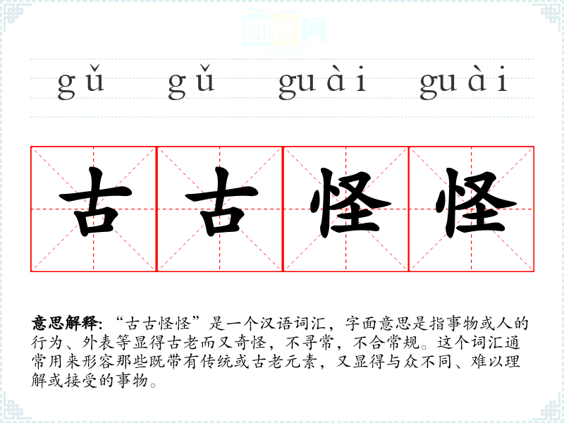 “古古怪怪”是一个汉语词汇,字面意思是指事物或人的行为、外表等显得古老而又奇怪,不寻常,不合常规。这个词汇通常用来形容那些既带有传统或古老元素,又显得与众不同、难以理解或接受的事物。