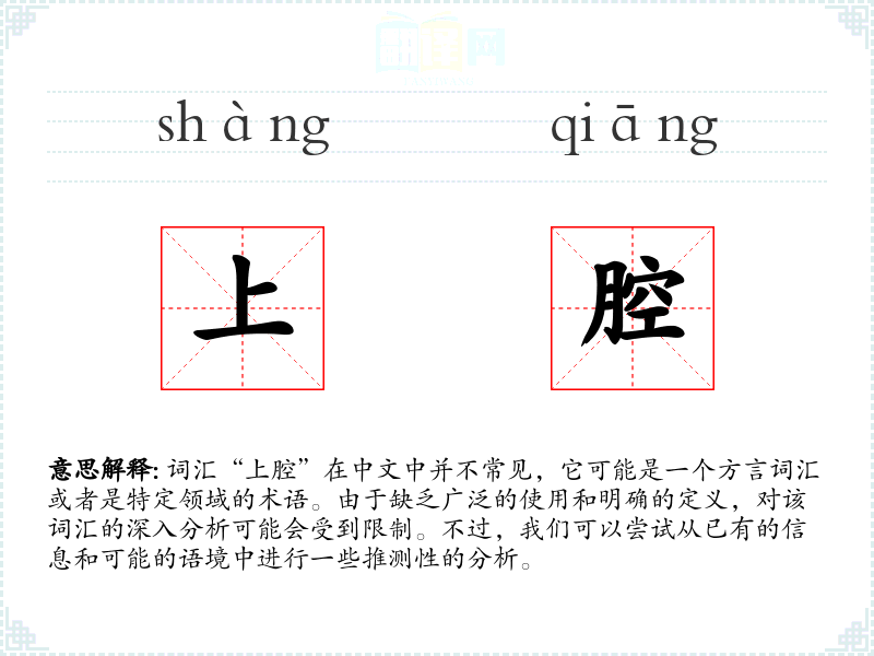词汇“上腔”在中文中并不常见,它可能是一个方言词汇或者是特定领域的术语。由于缺乏广泛的使用和明确的定义,对该词汇的深入分析可能会受到限制。不过,我们可以尝试从已有的信息和可能的语境中进行一些推测性的分析。