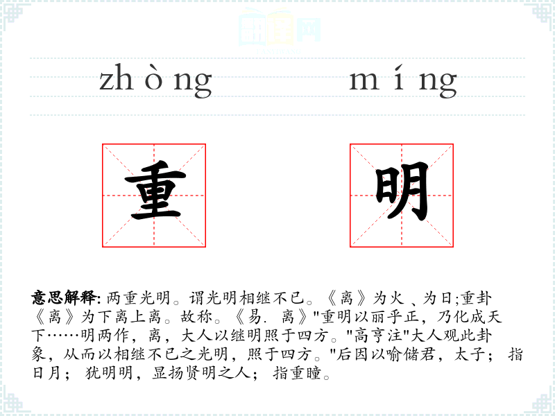 两重光明。谓光明相继不已。《离》为火﹑为日;重卦《离》为下离上离。故称。《易.离》"重明以丽乎正,乃化成天下……明两作,离,大人以继明照于四方。"高亨注"大人观此卦象,从而以相继不已之光明,照于四方。"后因以喻储君,太子; 指日月; 犹明明,显扬贤明之人; 指重瞳。