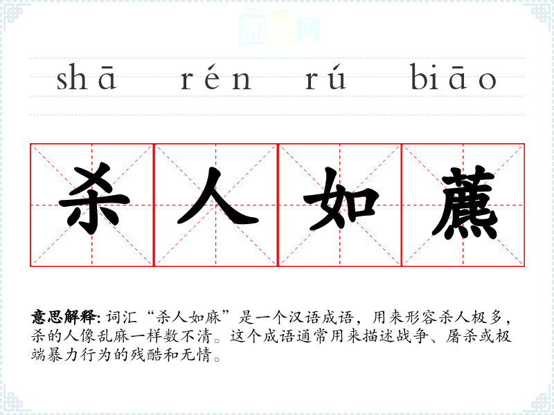 词汇“杀人如麻”是一个汉语成语,用来形容杀人极多,杀的人像乱麻一样数不清。这个成语通常用来描述战争、屠杀或极端暴力行为的残酷和无情。