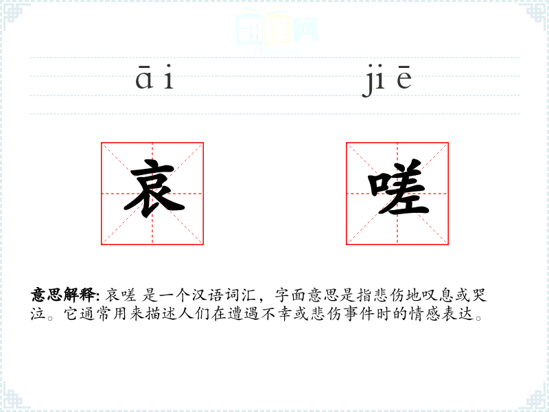 哀嗟 是一个汉语词汇,字面意思是指悲伤地叹息或哭泣。它通常用来描述人们在遭遇不幸或悲伤**时的情感表达。