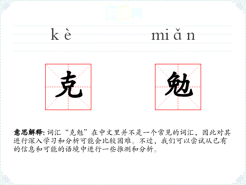“克勉”这个词由两个汉字组成:“克”和“勉”。在汉语中,“克”可以有克服、克制等含义,而“勉”则通常表示努力、勉励。结合起来,“克勉”可能指的是通过努力克服困难或挑战。