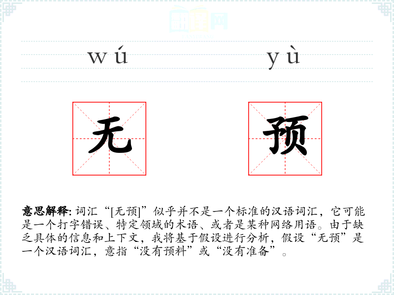 词汇“[无预]”似乎并不是一个标准的汉语词汇,它可能是一个打字错误、特定领域的术语、或者是某种网络用语。由于缺乏具体的信息和上下文,我将基于假设进行分析,假设“无预”是一个汉语词汇,意指“没有预料”或“没有准备”。