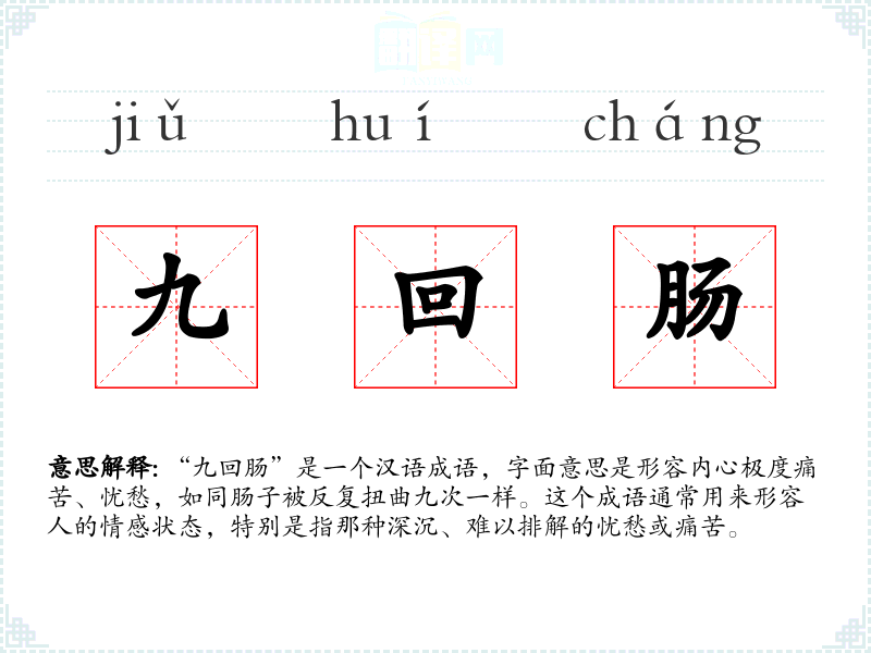 “九回肠”是一个汉语成语,字面意思是形容内心极度痛苦、忧愁,如同肠子被反复扭曲九次一样。这个成语通常用来形容人的情感状态,特别是指那种深沉、难以排解的忧愁或痛苦。