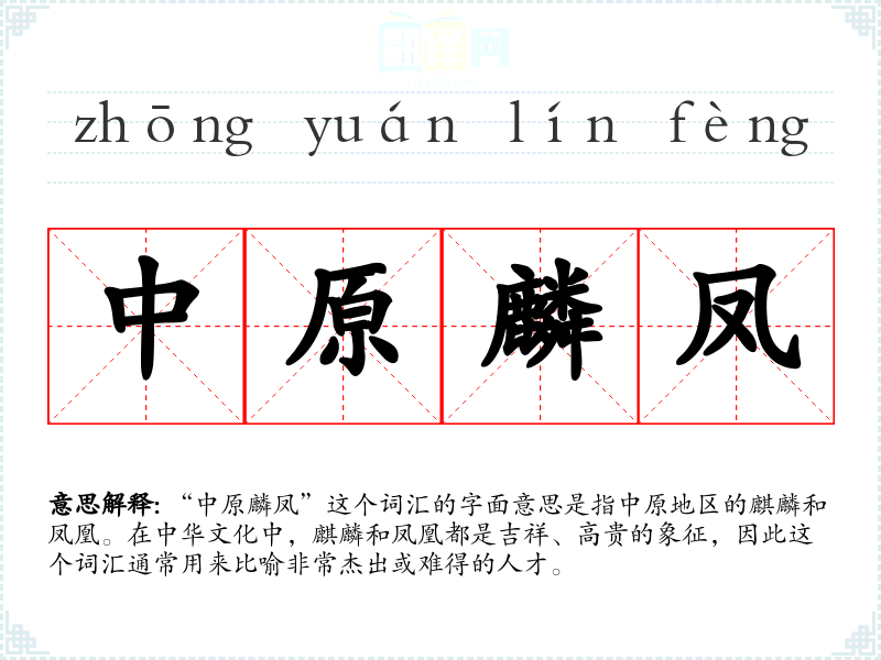 “中原麟凤”这个词汇的字面意思是指中原地区的麒麟和凤凰。在中华文化中,麒麟和凤凰都是吉祥、高贵的象征,因此这个词汇通常用来比喻非常杰出或难得的人才。