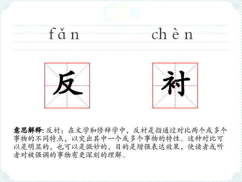 反衬:在文学和修辞学中,反衬是指通过对比两个或多个事物的不同特点,以突出其中一个或多个事物的特性。这种对比可以是明显的,也可以是微妙的,目的是增强表达效果,使读者或听者对被强调的事物有更深刻的理解。