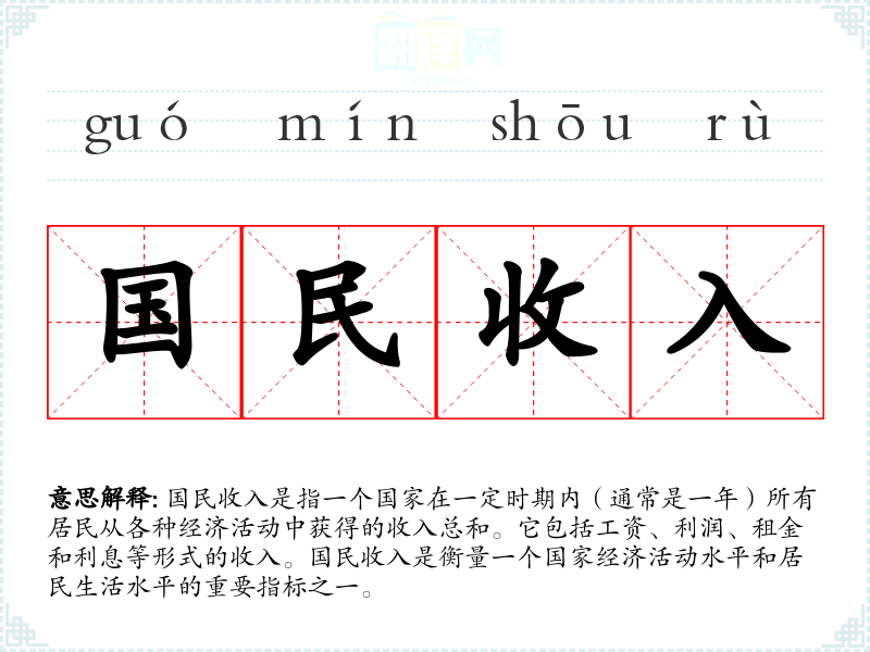 国民收入是指一个国家在一定时期内(通常是一年)所有居民从各种经济活动中获得的收入总和。它包括工资、利润、租金和利息等形式的收入。国民收入是衡量一个国家经济活动水平和居民生活水平的重要指标之一。