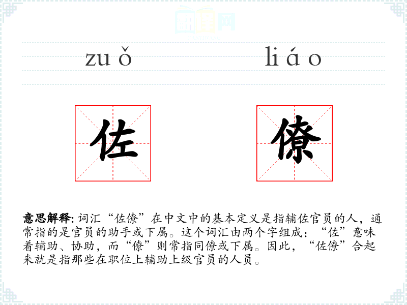 词汇“佐僚”在中文中的基本定义是指辅佐官员的人,通常指的是官员的助手或下属。这个词汇由两个字组成:“佐”意味着辅助、协助,而“僚”则常指同僚或下属。因此,“佐僚”合起来就是指那些在职位上辅助上级官员的人员。