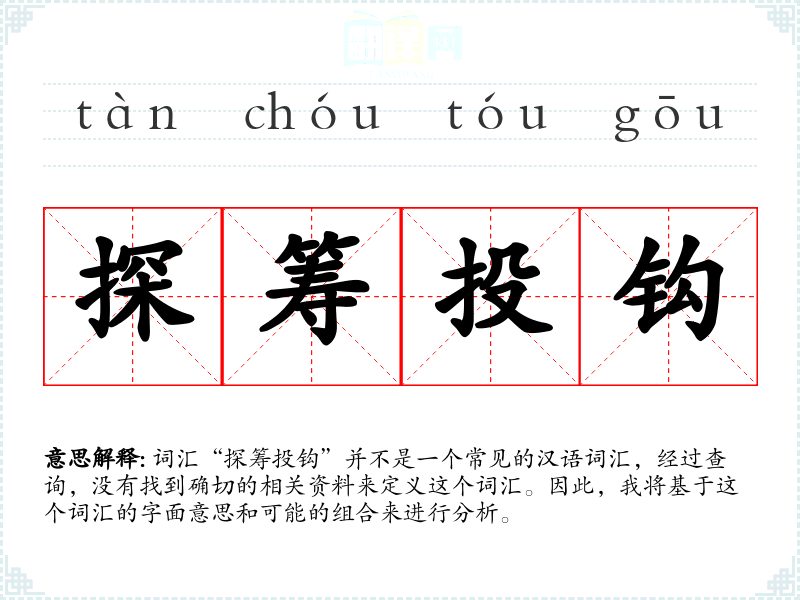 “探筹投钩”字面意思可能是指通过探索、筹划和投掷钩子来达到某种目的。这里的“探”可能指的是探索或调查,“筹”可能指的是筹划或计划,“投”可能指的是投掷或投放,“钩”则可能指的是钩子或类似工具。