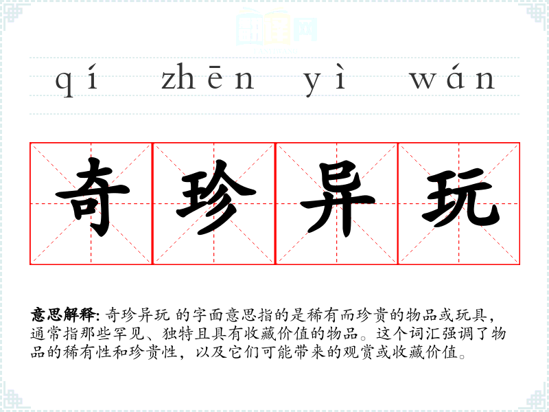 奇珍异玩 这个词汇的词源较为传统,其中“奇珍”源自古代对稀有珍贵物品的称呼,“异玩”则指那些与众不同的玩具或物品。随着时间的推移,这个词汇逐渐被用来形容那些具有高度收藏价值的物品。