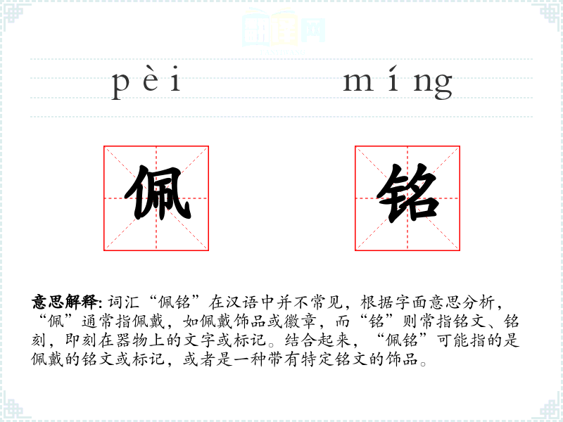 - 反义词:无(由于“佩铭”不是一个常用词汇,反义词不明显)