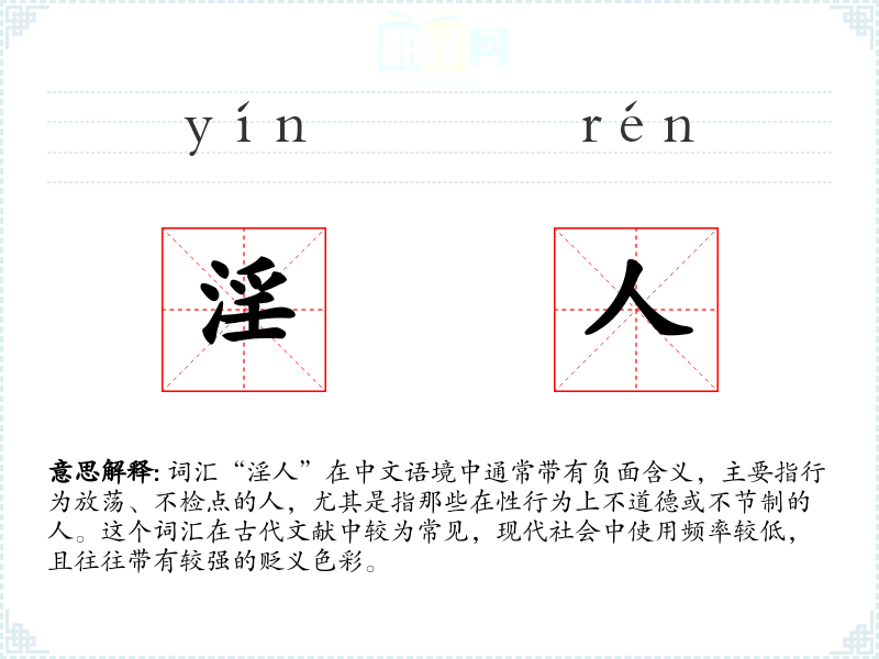 “淫人”字面意思是指行为放荡、不检点的人。在古代,这个词汇可能还涉及到对性行为的过度追求或不正当行为。