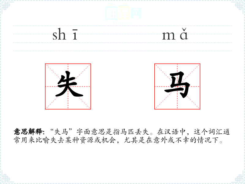 “失马”字面意思是指马匹丢失。在汉语中,这个词汇通常用来比喻失去某种资源或机会,尤其是在意外或不幸的情况下。