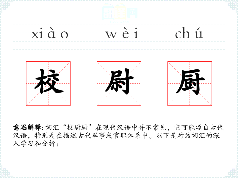 词汇“校尉厨”在现代汉语中并不常见,它可能源自古代汉语,特别是在描述古代军事或官职体系中。以下是对该词汇的深入学*和分析: