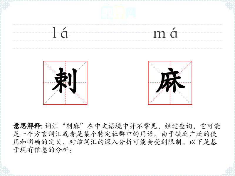 词汇“剌麻”在中文语境中并不常见,经过查询,它可能是一个方言词汇或者是某个特定社群中的用语。由于缺乏广泛的使用和明确的定义,对该词汇的深入分析可能会受到限制。以下是基于现有信息的分析: