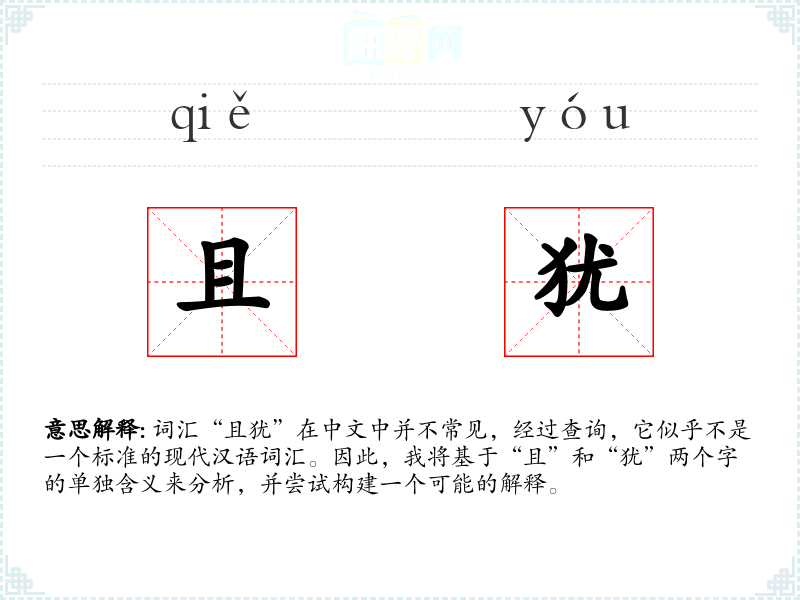 词汇“且犹”在中文中并不常见,经过查询,它似乎不是一个标准的现代汉语词汇。因此,我将基于“且”和“犹”两个字的单独含义来分析,并尝试构建一个可能的解释。