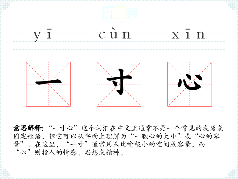 - 反义词:无(由于“一寸心”不是一个常用词汇,反义词不明显)