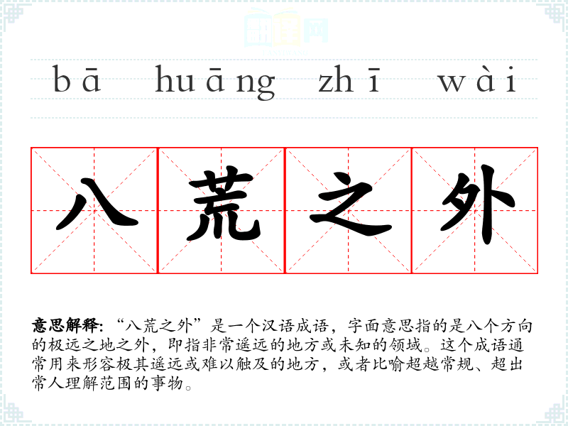 “八荒之外”是一个汉语成语,字面意思指的是八个方向的极远之地之外,即指非常遥远的地方或未知的领域。这个成语通常用来形容极其遥远或难以触及的地方,或者比喻超越常规、超出常人理解范围的事物。