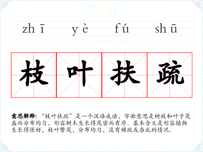 “枝叶扶疏”是一个汉语成语,字面意思是树枝和叶子茂盛而分布均匀,形容树木生长得茂密而有序。基本含义是形容植物生长得很好,枝叶繁茂,分布均匀,没有稀疏或杂乱的情况。