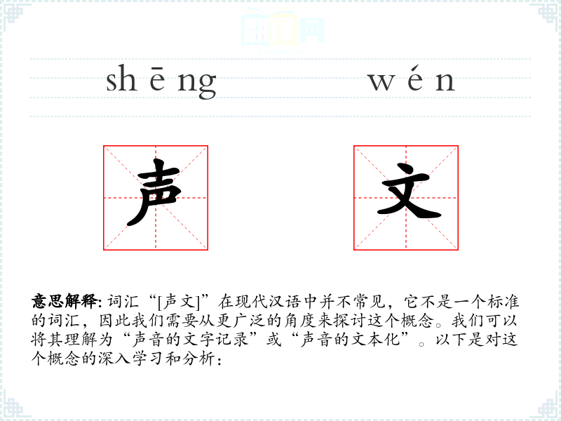 - 专业领域:在音乐、语言学或声学领域,“声文”可能指的是对声音的科学记录或分析。
