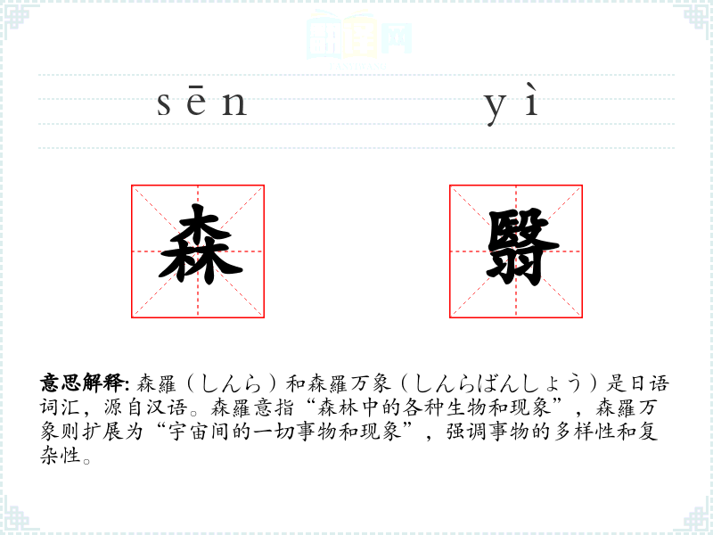 森羅(しんら)和森羅万象(しんらばんしょう)是日语词汇,源自汉语。森羅意指“森林中的各种生物和现象”,森羅万象则扩展为“宇宙间的一切事物和现象”,强调事物的多样性和复杂性。