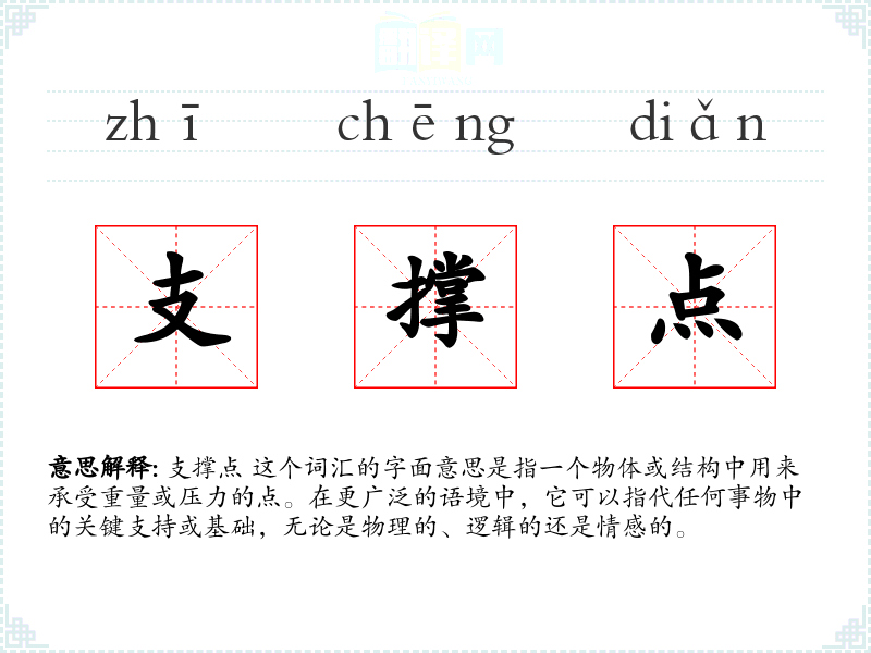 支撑点 这个词汇的字面意思是指一个物体或结构中用来承受重量或压力的点。在更广泛的语境中,它可以指代任何事物中的关键支持或基础,无论是物理的、逻辑的还是情感的。