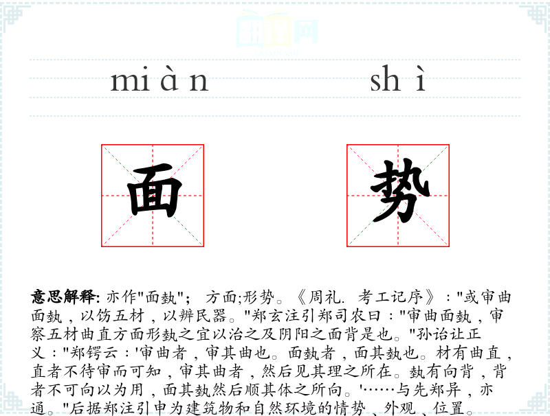 1.亦作"面埶"; 方面;形势。《周礼.考工记序》﹕"或审曲面埶﹐以饬五材﹐以辨民器。"郑玄注引郑司农曰﹕"审曲面埶﹐审察五材曲直方面形埶之宜以治之及阴阳之面背是也。"孙诒让正义﹕"郑锷云﹕'审曲者﹐审其曲也。面埶者﹐面其埶也。材有曲直﹐直者不待审而可知﹐审其曲者﹐然后见其理之所在。埶有向背﹐背者不可向以为用﹐面其埶然后顺其体之所向。'……与先郑异﹐亦通。"后据郑注引申为建筑物和自然环境的情势﹑外观﹑位置。
