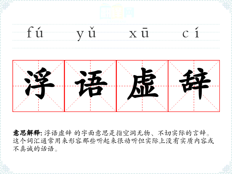 浮语虚辞 的字面意思是指空洞无物、不切实际的言辞。这个词汇通常用来形容那些听起来很动听但实际上没有实质内容或不真诚的话语。