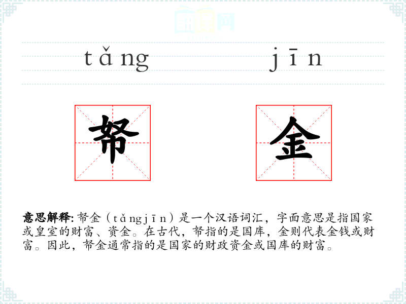 帑金(tǎng jīn)是一个汉语词汇,字面意思是指国家或皇室的财富、资金。在古代,帑指的是国库,金则代表金钱或财富。因此,帑金通常指的是国家的财政资金或国库的财富。
