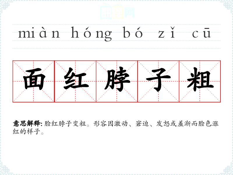 脸红脖子变粗。形容因激动、窘迫、发怒或羞渐而脸色涨红的样子。