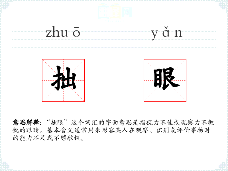 “拙眼”这个词汇的字面意思是指视力不佳或观察力不敏锐的眼睛。基本含义通常用来形容某人在观察、识别或评价事物时的能力不足或不够敏锐。