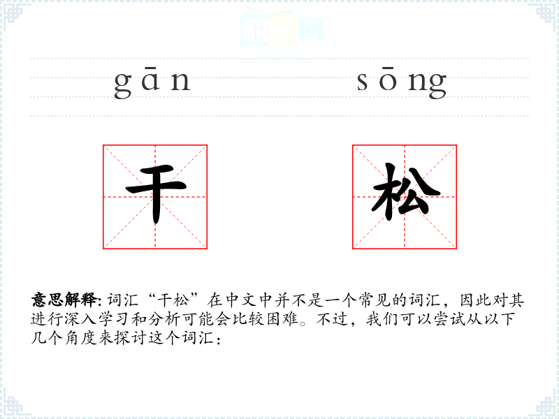 总的来说,“干松”这个词组在中文中并不是一个常用词汇,其使用和理解可能需要特定的语境或背景。在语言学习和表达中,了解这样的词汇可以帮助我们更全面地理解中文的多样性和丰富性。