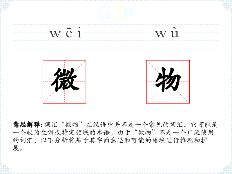 词汇“微物”在汉语中并不是一个常见的词汇,它可能是一个较为生僻或特定领域的术语。由于“微物”不是一个广泛使用的词汇,以下分析将基于其字面意思和可能的语境进行推测和扩展。