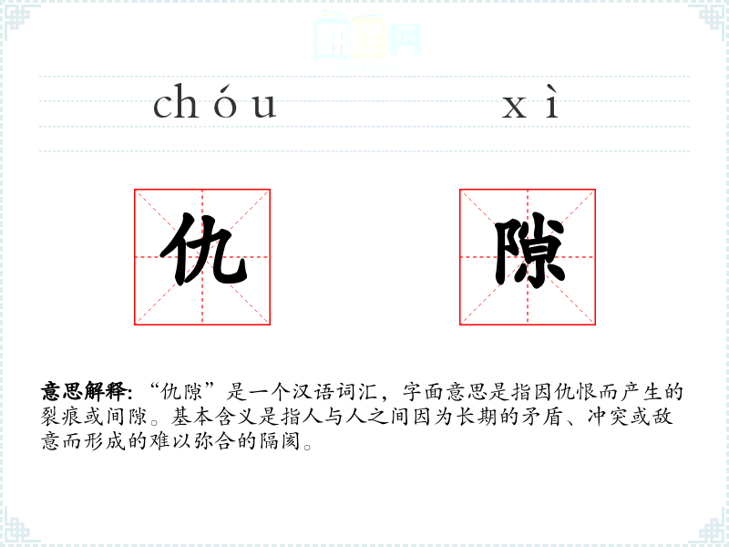 - 文学:在文学作品中,“仇隙”常用来描述人物之间深刻的敌对关系,如家族间的世仇或个人间的深仇大恨。