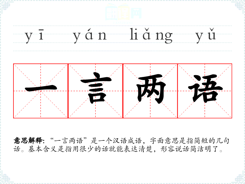 “一言两语”是一个汉语成语,字面意思是指简短的几句话。基本含义是指用很少的话就能表达清楚,形容说话简洁明了。