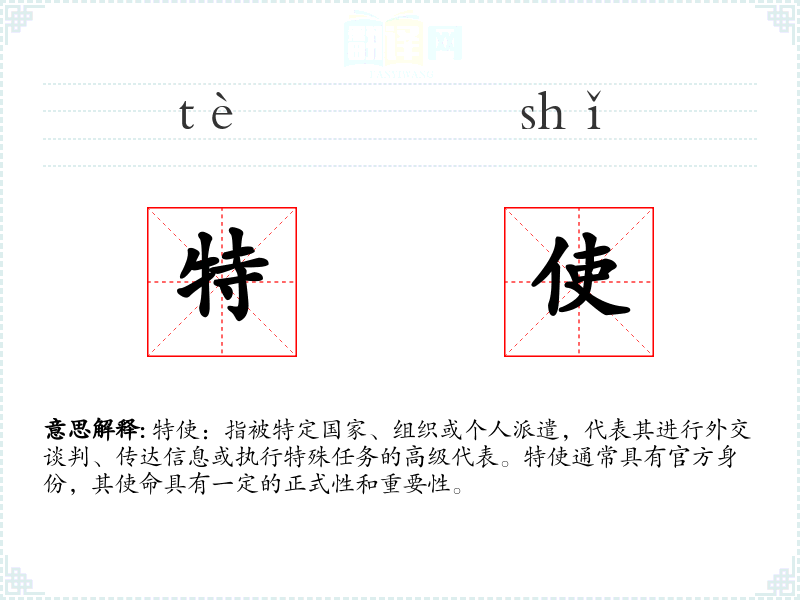 - 专业领域:在国际关系和外交领域,特使是一个常用词汇,用于描述那些被派遣执行特殊外交任务的官员。