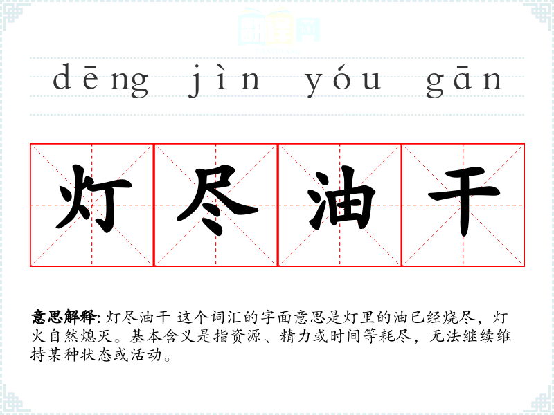 灯尽油干 这个词汇的字面意思是灯里的油已经烧尽,灯火自然熄灭。基本含义是指资源、精力或时间等耗尽,无法继续维持某种状态或活动。