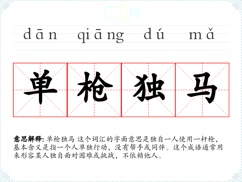 单枪独马 这个词汇的字面意思是独自一人使用一杆枪,基本含义是指一个人单独行动,没有帮手或同伴。这个成语通常用来形容某人独自面对困难或挑战,不依赖他人。