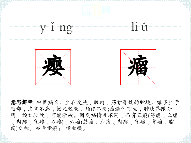 1.中医病名。生在皮肤﹑肌肉﹑筋骨等处的肿块。瘿多生于颈部﹐皮宽不急﹐按之较软﹐始终不溃;瘤遍体可生﹐肿块界限分明﹐按之较硬﹐可能溃破。因发病情况不同﹐而有五瘿(筋瘿﹑血瘿﹑肉瘿﹑气瘿﹑石瘿)﹑六瘤(筋瘤﹑血瘤﹑肉瘤﹑气瘤﹑骨瘤﹑脂瘤)之称。亦专指瘿; 指虫瘿。